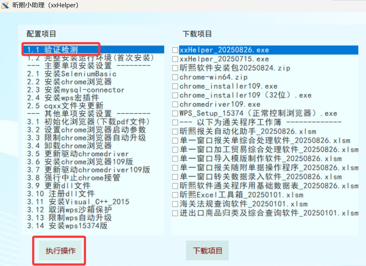 日常使用过程中,昕熙通关软件出现任何问题,均首先进行验证检测,可以通过昕熙小助理进行检测,也可以通过通关软件工作簿的程序窗体执行检测。部分问题可以通过检测直接解决,一些大的配置问题也会给出提示,通过昕熙小助理单项安装来完善运行环境。进行单项安装的基础是“昕熙软件”文件夹已自动建立(如:D:\昕熙软件),在“昕熙软件\program\”路径下包含了第三方应用,昕熙小助理据此进行安装。也可人工找到安装文件进行安装。