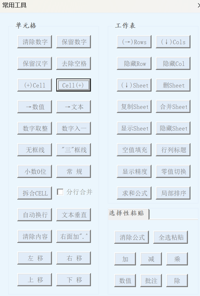 1、常用工具:与单元格区域和工作表行、列相关的一些文本、格式处理功能;