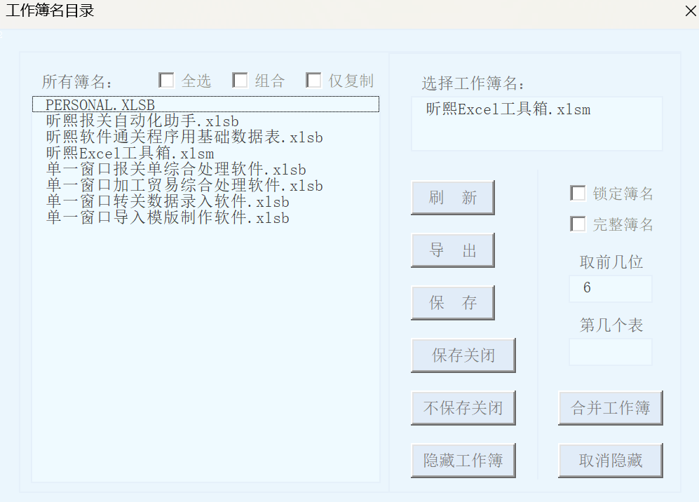 5、簿名目录:对当前所有打开工作簿进行处理,可以批量保存、关闭、合并、显示、隐藏工作簿等;