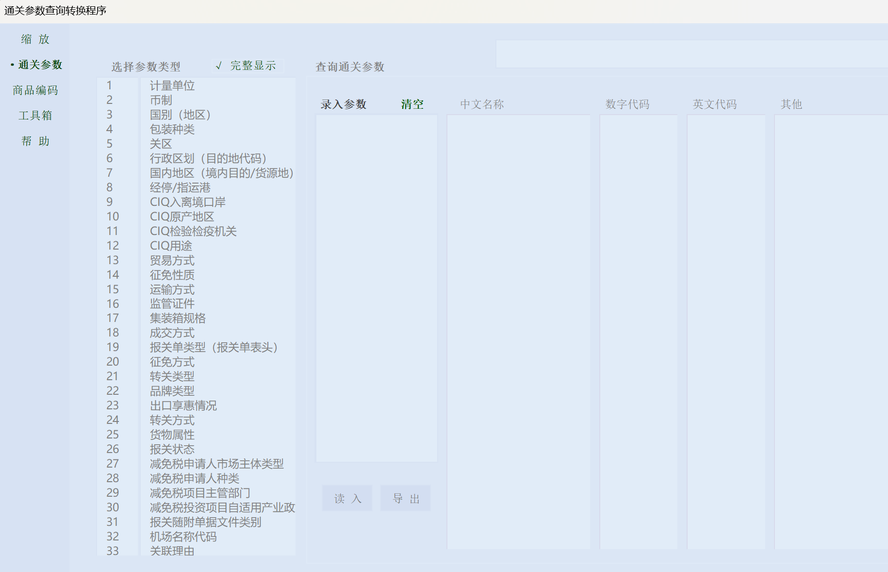 在实际通关活动中,我们会和大量的通关参数打交道,经常会对通关参数进行查询和转换,主要涉及参数的中文名称、数字代码、英文代码等,最常用的通关参数我们一般都会记得,但多数还是需要查询的,查询的途径倒是挺多,单一窗口、海关网站是最有效的查询途径,一些公司网站也会提供查询。本程序以操作简便、参数全面、功能完善为最终目标,希望成为一种有效的通关参数查询方式。